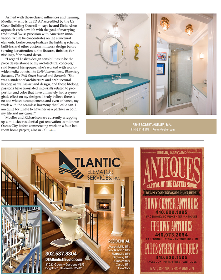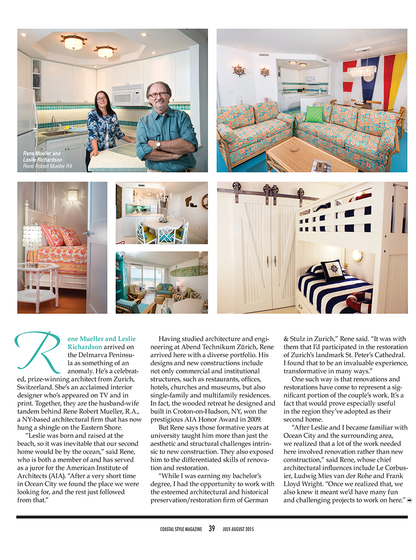 Rene R. Mueller Architect + Planner is featured in the COASTAL STYLE MAGAZINE, July-August 2015 issue. The article highlights the background of the “Partners by Design” team, the fine-tuned planning process of the firm, the meticulous interior design work, the team approach to execute the projects and sample of the extensive renovation projects in Ocean City Maryland.