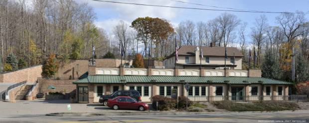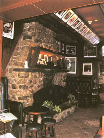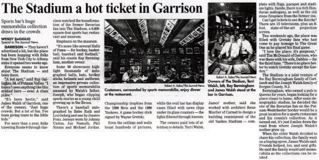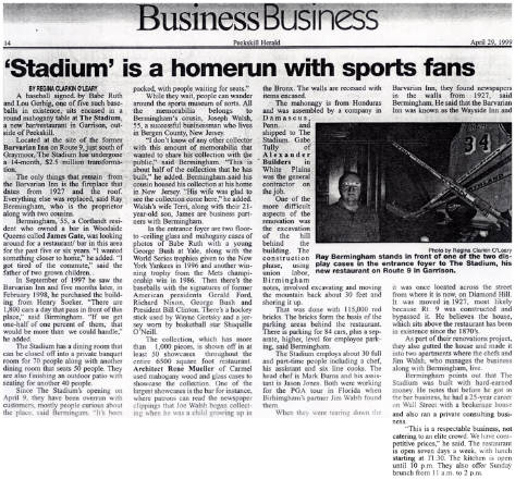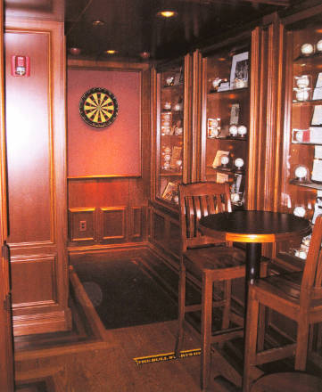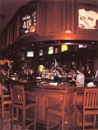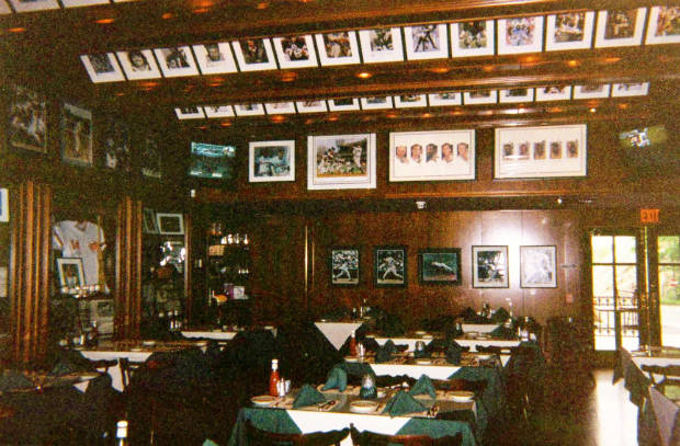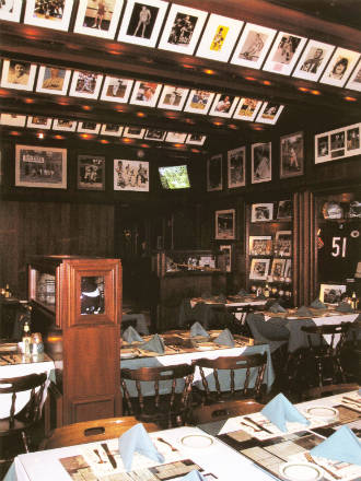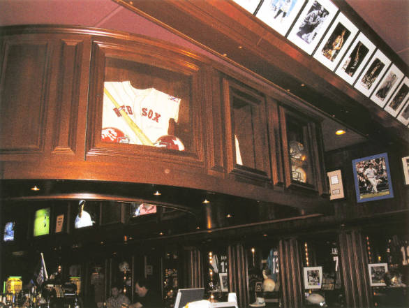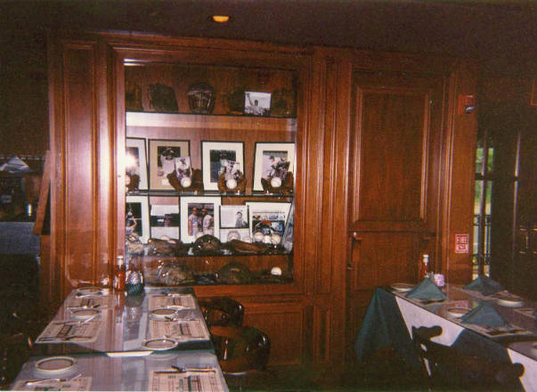 The exterior of the restaurant is reminiscent of the old Yankee Stadium. The 6,500 sq. ft. restaurant has two dining areas for 120 people with an outdoor patio for 40 more, a major bar with 11 overhead televisions and a large 8-foot screen to display major sports events . More than 1000 original sport memorabilia items are displayed in over 50 showcases.